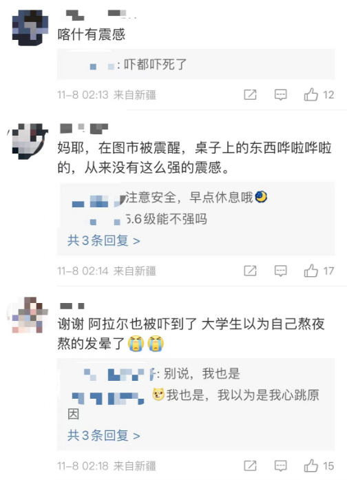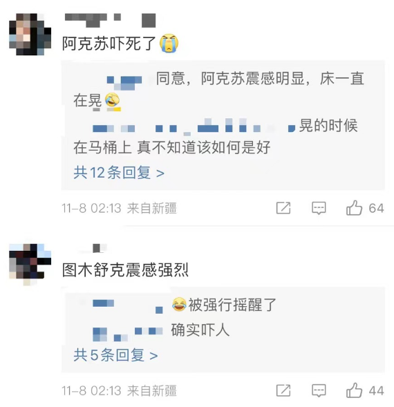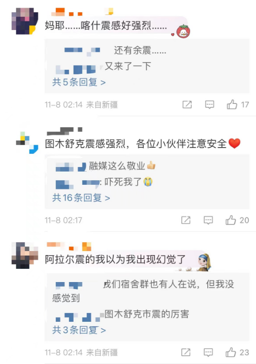 在第一次地震后,不少網(wǎng)友表示“震感很強(qiáng)烈”“被晃醒了”。