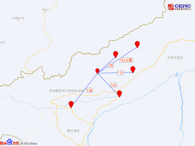 據(jù)中國(guó)地震臺(tái)網(wǎng)消息,數(shù)次地震中最高的5.4級(jí)地震,震中位于北緯40.47度,東經(jīng)77.72度,距阿合奇縣78公里、距巴楚縣103公里、距柯坪縣113公里、距伽師縣138公里、距烏什縣152公里,距圖木舒克市133公里,距烏魯木齊市897公里。
