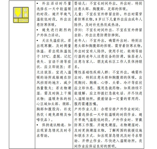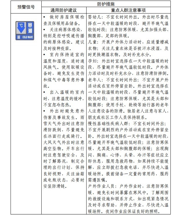 針對(duì)寒潮預(yù)警信號(hào)等級(jí),我們提出分級(jí)人群防護(hù)措施建議。