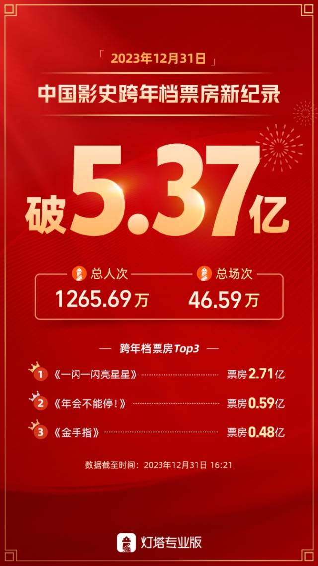 據(jù)燈塔專業(yè)版數(shù)據(jù),截至12月31日16時(shí)21分,2023跨年檔總票房超5.37億,打破中國(guó)影史跨年檔最高票房紀(jì)錄。