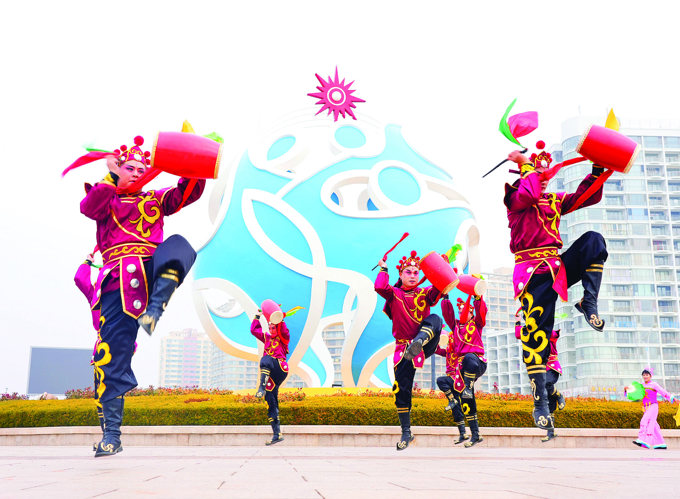 在煙臺(tái)海陽市鳳凰廣場,海陽市京劇團(tuán)的演員們正在排練、展示海陽大秧歌。海陽大秧歌是一種集歌、舞、戲于一體的民間藝術(shù)形式,屬于山東三大秧歌之一。作為首批入選的國家級(jí)非物質(zhì)文化遺產(chǎn),先后參加了北京奧運(yùn)會(huì)演出、上海世博會(huì)巡演、西安園藝博覽會(huì)巡演、塞爾維亞貝爾格萊德新春匯演等國內(nèi)外大型演出。