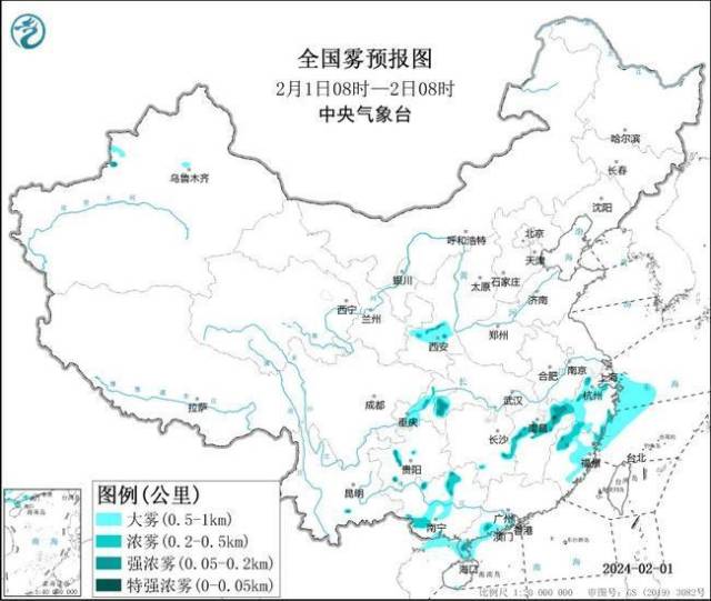 中央氣象臺2月1日06時繼續(xù)發(fā)布大霧黃色預警: