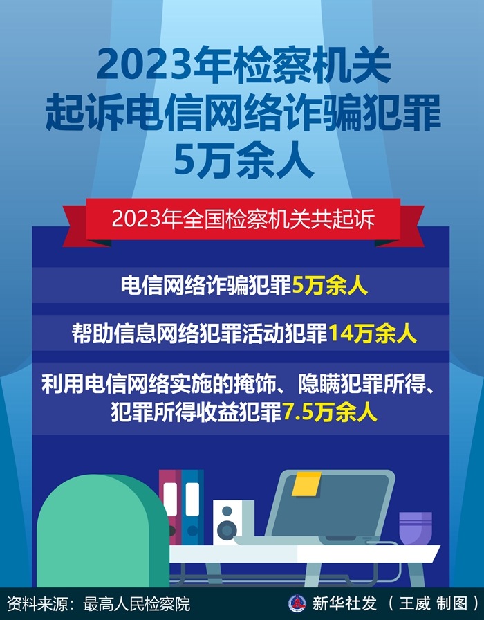 新華社北京3月3日電(記者邢拓)記者3日從最高人民檢察院獲悉,2023年全國檢察機(jī)關(guān)共起訴電信網(wǎng)絡(luò)詐騙犯罪5萬余人、幫助信息網(wǎng)絡(luò)犯罪活動犯罪14萬余人、利用電信網(wǎng)絡(luò)實(shí)施的掩飾、隱瞞犯罪所得、犯罪所得收益犯罪7.5萬余人。