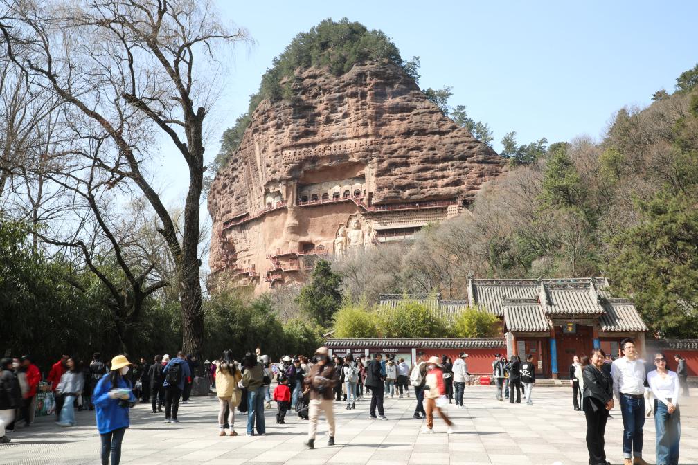 2024年3月20日,游客在天水市麥積區(qū)游覽麥積山石窟。新華社記者 馬希平 攝