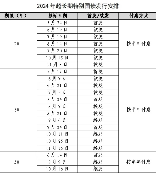 根據(jù)此次安排,今年超長(zhǎng)期特別國(guó)債發(fā)行期限分別為20年、30年和50年,付息方式均為按半年付息。其中,20年期超長(zhǎng)期特別國(guó)債發(fā)行7只,首發(fā)2只、續(xù)發(fā)5只;30年期超長(zhǎng)期特別國(guó)債發(fā)行12只,首發(fā)3只、續(xù)發(fā)9只;50年期超長(zhǎng)期特別國(guó)債發(fā)行3只,首發(fā)1只、續(xù)發(fā)2只。