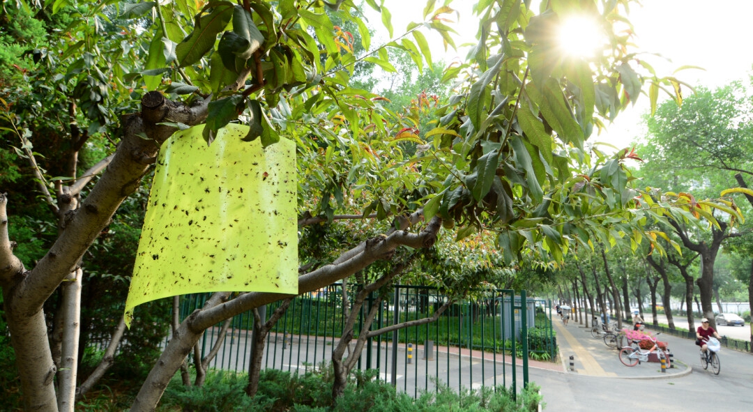 △利用小昆蟲對(duì)黃色的趨性,在綠化帶懸掛黏性的黃板能起到一定程度的防蟲作用。薊馬還對(duì)藍(lán)色有著獨(dú)特的喜好,因此在薊馬危害嚴(yán)重的地方還能見到藍(lán)色的黏板。