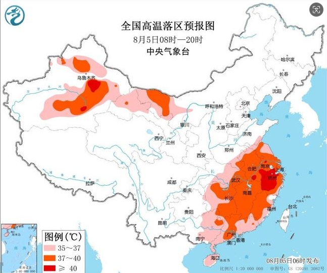 預(yù)計(jì)8月5日白天,內(nèi)蒙古西部、新疆準(zhǔn)噶爾盆地和南疆盆地、甘肅河西、河南南部、安徽、山東南部、江蘇、上海、湖北大部、湖南、江西、浙江、福建大部、廣西中東部、廣東、海南島大部等地有35℃以上高溫天氣,其中,內(nèi)蒙古西部、新疆準(zhǔn)噶爾盆地和南疆盆地、安徽大部、江蘇大部、上海大部、湖北東部、湖南大部、江西、浙江、福建大部、廣東中部和北部、廣西東北部等地部分地區(qū)最高氣溫37℃以上,新疆吐魯番盆地、安徽南部、浙江中西部等地局地可達(dá)40℃以上。
