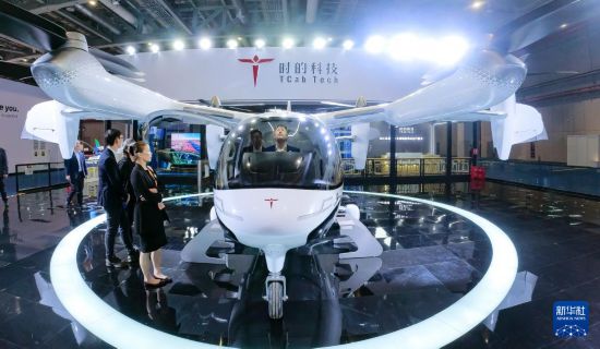 11月5日,參會(huì)者在第七屆進(jìn)博會(huì)汽車(chē)展區(qū)體驗(yàn)時(shí)的科技E20 eVTOL電動(dòng)垂直起降飛行器。