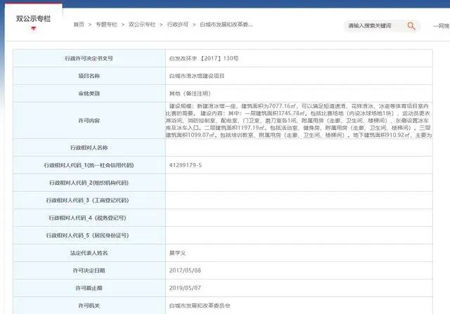 記者注意到,在當?shù)卣俜骄W(wǎng)站上,有關(guān)于該項目建設(shè)行政許可相關(guān)材料:白發(fā)改環(huán)字【2017】130號顯示:白城市滑冰館建設(shè)項目的許可單位為白城市發(fā)展和改革委員會,許可決定日期為2017年05月08日,建設(shè)規(guī)模為:新建滑冰館一座,建筑面積為7077.16㎡,可以滿足短道速滑、花樣滑冰、冰壺等體育項目室內(nèi)比賽的需要。