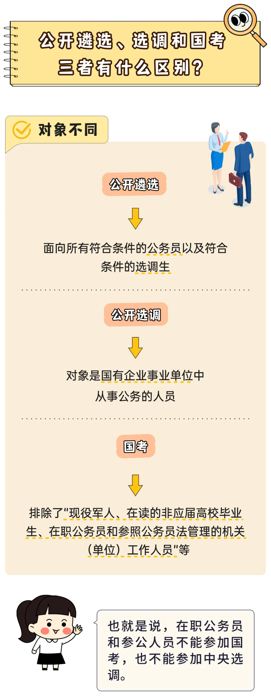 據(jù)統(tǒng)計,本次公開遴選和公開選調(diào)中央機關(guān)共有41個部門參加,計劃選拔371人。其中,公開遴選職位為一級調(diào)研員及以下職級,計劃選拔350人;公開選調(diào)職位包括副處長職務(wù)和一級至四級調(diào)研員職級,計劃選拔21人。而今年的國考,共招錄3.97萬人。