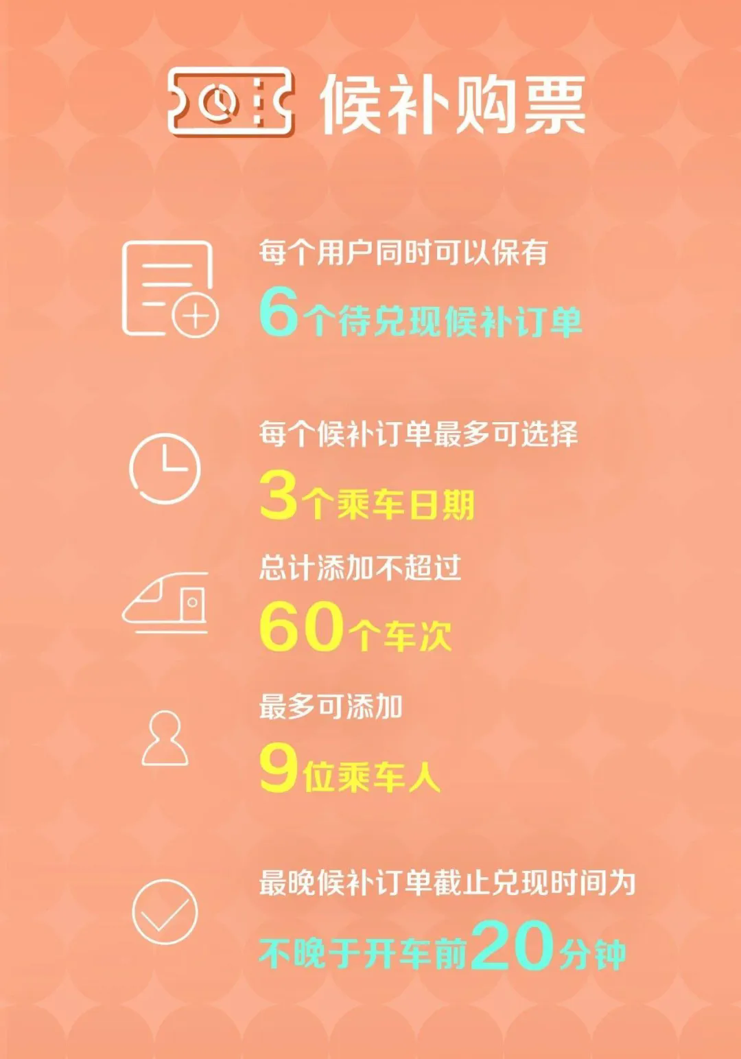 每個用戶可以有6個待兌現(xiàn)候補訂單,每個候補訂單最多可選擇3個乘車日期,總計添加不超過60個車次。