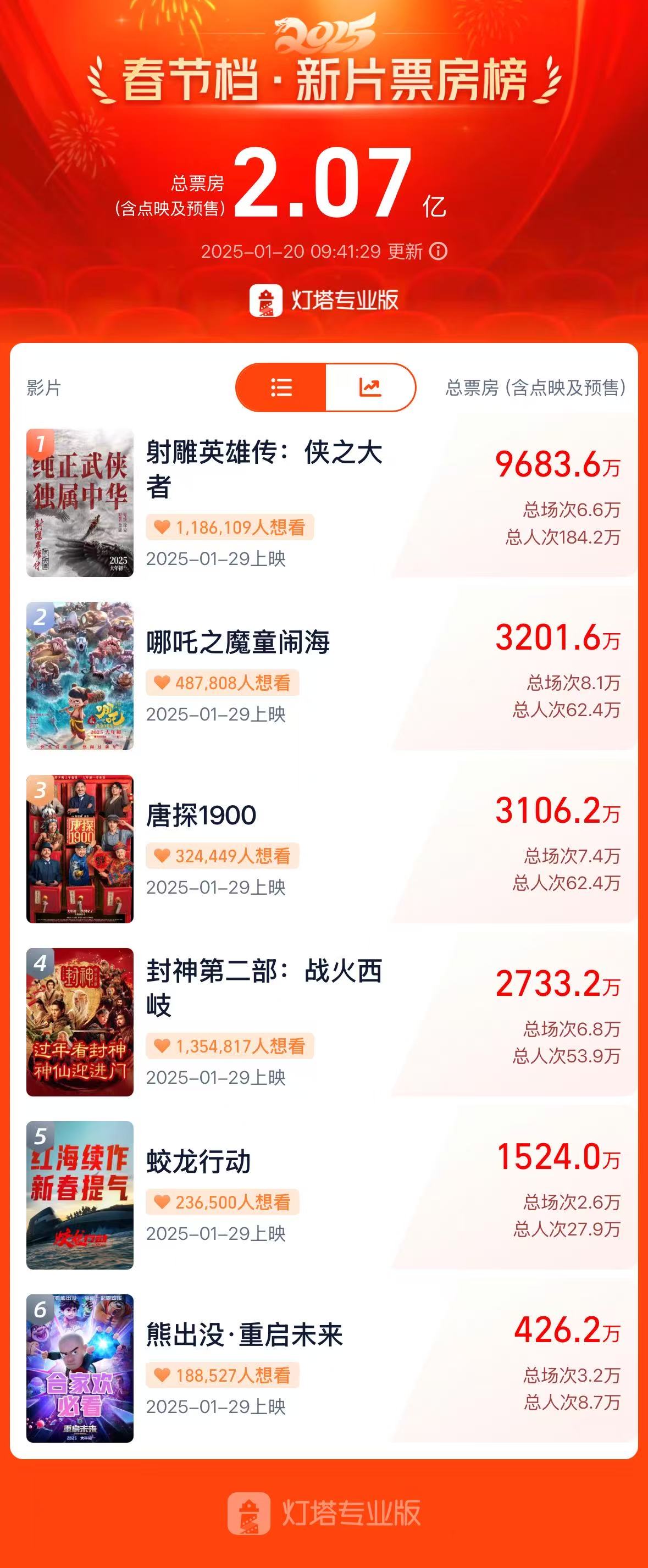 據(jù)燈塔專業(yè)版消息,截至1月20日9時16分,春節(jié)檔電影預(yù)售總票房破2億,刷新中國影史春節(jié)檔預(yù)售票房最快破2億紀(jì)錄。