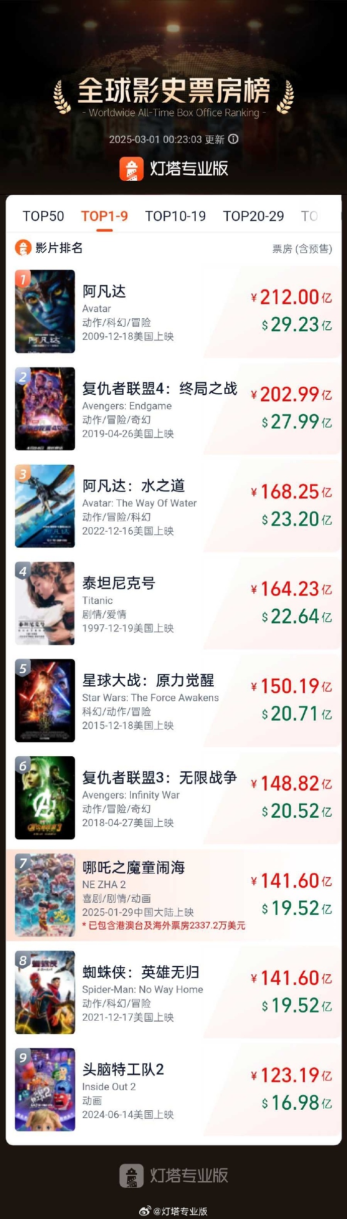 據(jù)網(wǎng)絡(luò)平臺(tái)數(shù)據(jù),截至3月1日,影片《哪吒之魔童鬧海》(簡(jiǎn)稱《哪吒2》)全球票房(含預(yù)售)突破141.60億,超《蜘蛛俠:英雄無歸》票房成績(jī),進(jìn)入全球影史票房榜前7名。