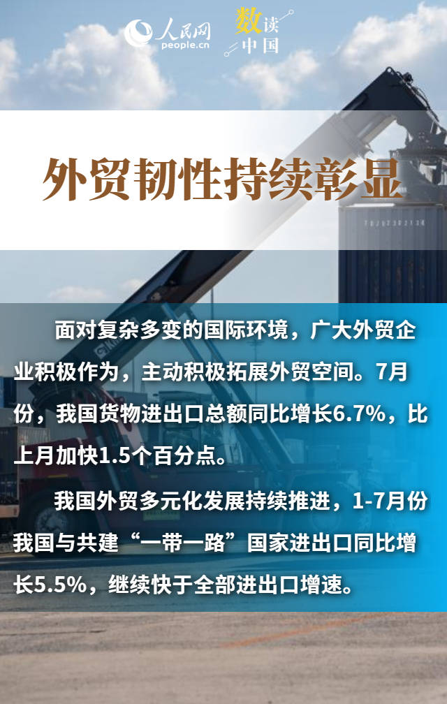 進(jìn)出口規(guī)模創(chuàng)歷史新高、“朋友圈”不斷擴(kuò)大、民營(yíng)企業(yè)持續(xù)創(chuàng)新……數(shù)據(jù)顯示,今年前7個(gè)月,我國(guó)貨物貿(mào)易進(jìn)出口總值25.7萬(wàn)億元,同比增長(zhǎng)3.5%。在外部挑戰(zhàn)之下,我國(guó)貨物進(jìn)出口持續(xù)增長(zhǎng),展現(xiàn)出較強(qiáng)韌性和活力,為世界經(jīng)濟(jì)復(fù)蘇注入了中國(guó)力量。