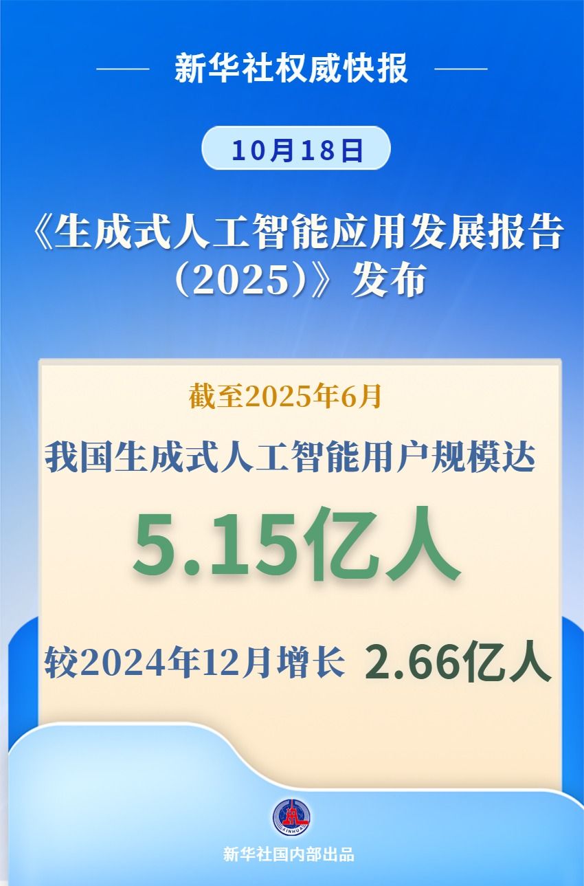 10月18日,中國互聯(lián)網(wǎng)絡(luò)信息中心在2025(第六屆)中國互聯(lián)網(wǎng)基礎(chǔ)資源大會上發(fā)布《生成式人工智能應(yīng)用發(fā)展報告(2025)》。報告顯示,截至2025年6月,我國生成式人工智能用戶規(guī)模達(dá)5.15億人,較2024年12月增長2.66億人,用戶規(guī)模半年翻番;普及率為36.5%。