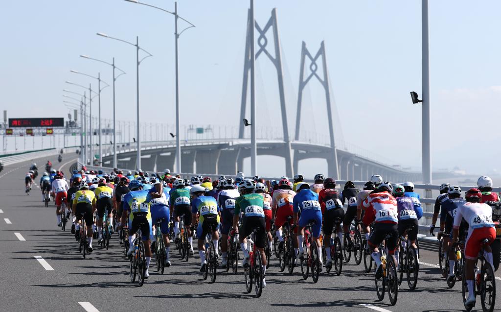11月8日,參賽選手在港珠澳大橋騎行。當(dāng)日進(jìn)行的第十五屆全國運動會公路自行車男子個人賽,賽道全程231.8公里,選手經(jīng)過港珠澳大橋,跨越粵港澳三地。圖源:新華社