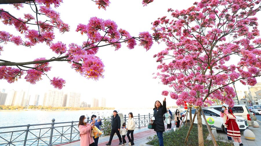 1月31日,在冬日暖陽(yáng)下,陸陸續(xù)續(xù)有市民來(lái)打卡,邂逅浪漫的紫花風(fēng)鈴。走近紫花風(fēng)鈴木,只見(jiàn)滿樹(shù)枝頭都是一簇簇紫紅色的花朵,整株樹(shù)幾乎沒(méi)有葉片,猶如編織了一個(gè)紫色的風(fēng)鈴。漫步其中,讓人在冬天里享受春天的感覺(jué)。