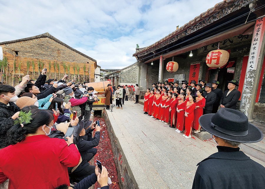 記者在現(xiàn)場(chǎng)看到,當(dāng)天,當(dāng)年添丁的媳婦挑著籮筐跟隨在隊(duì)伍中去上燈,婆婆和妯娌也加入到了其中,裝有物品的籮筐有些重,婆婆、妯娌為媳婦分擔(dān)一路的勞累,相互接力,互換著挑起籮筐,也接力挑起了家庭的擔(dān)子,體現(xiàn)出濃濃的婆媳、妯娌和睦持家的情義。沿途各姓氏上燈、巡游的隊(duì)伍在街頭相逢,還會(huì)相互問(wèn)候祝福。