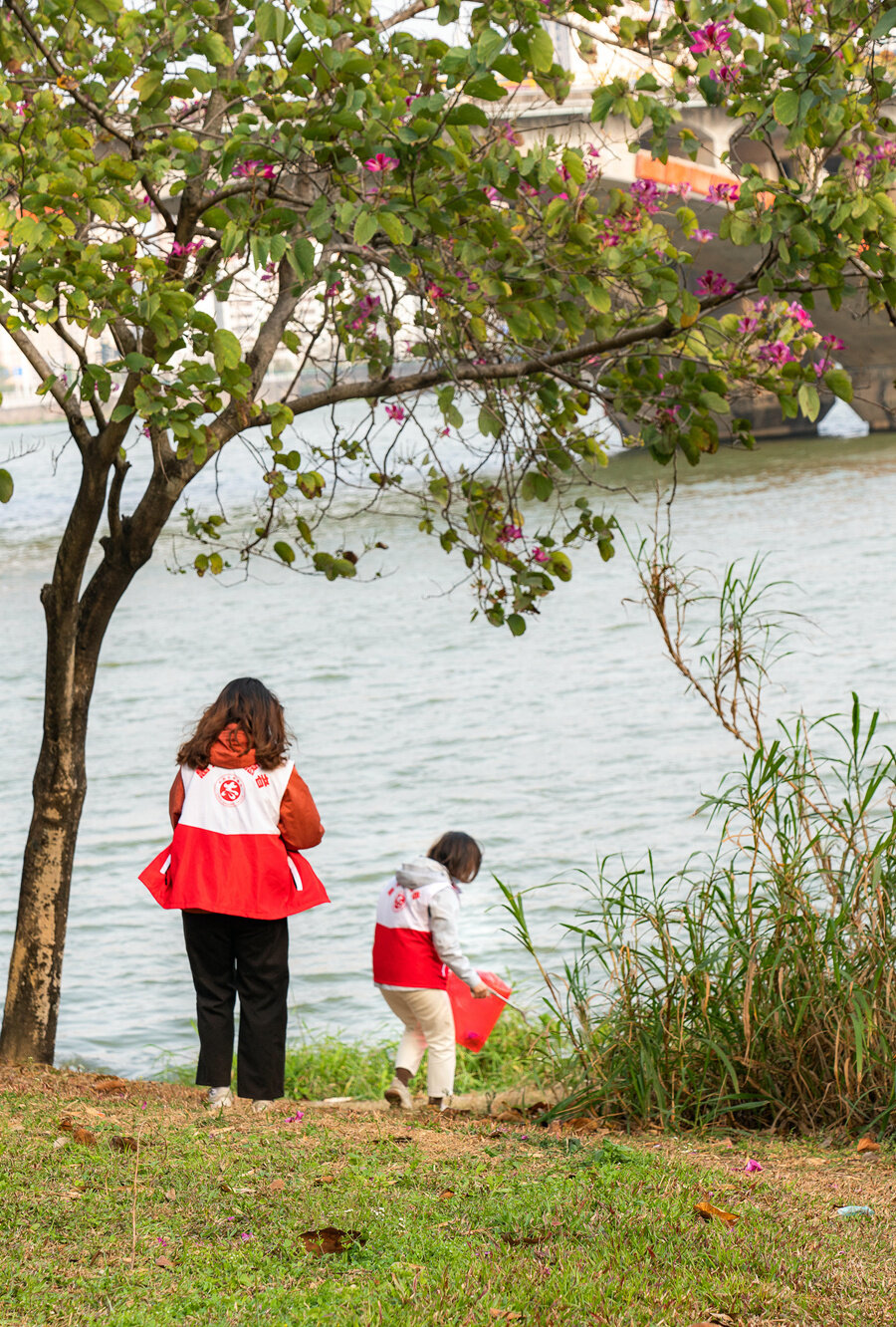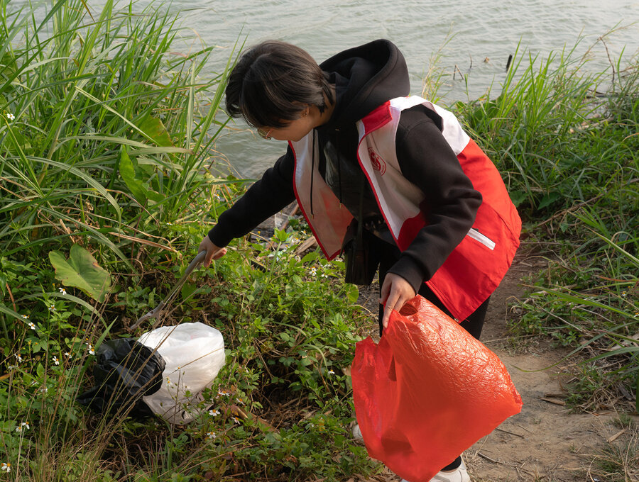 在江邊的草叢里,惠報志愿者彭覓笑彎著腰,專注細致地清理著隱藏在草叢間隙里的垃圾。在她身后不遠處,放有志愿者們收集的幾袋垃圾;輬笾驹刚吒蓜攀悖屧谂赃\送垃圾的環(huán)衛(wèi)工人也豎起大拇指點贊:“謝謝你們,你們經(jīng)常來,現(xiàn)在公園的環(huán)境變得越來越好,感謝你們的努力!