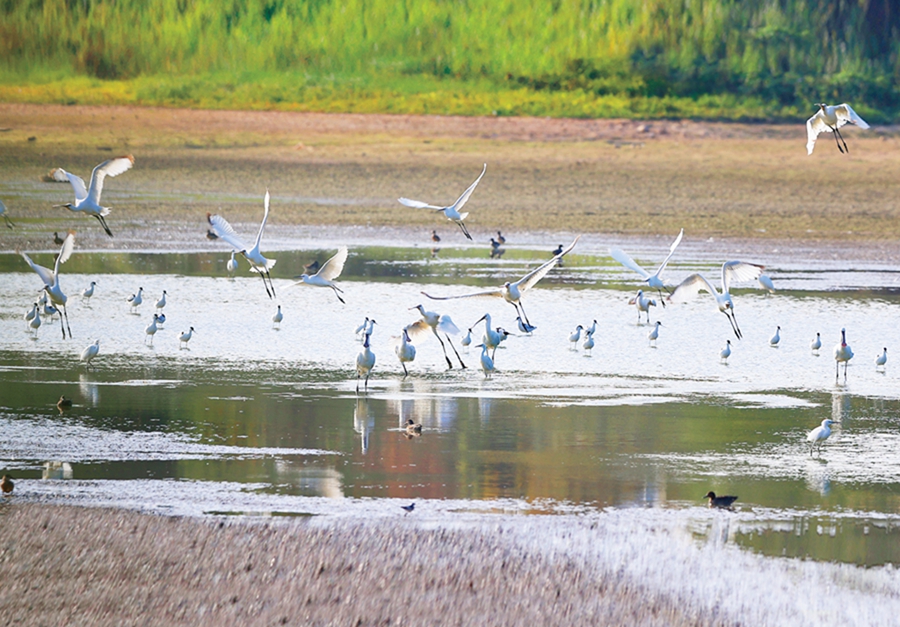 40來(lái)只黑臉琵鷺成一字隊(duì)形排開(kāi),200多只長(zhǎng)腳反嘴鷸結(jié)隊(duì)向前推進(jìn),20多只琵嘴鴨、白鷺、灰鷺穿插群中,在惠城區(qū)三棟鎮(zhèn)西枝江畔一個(gè)水塘里共享饕餮盛宴。