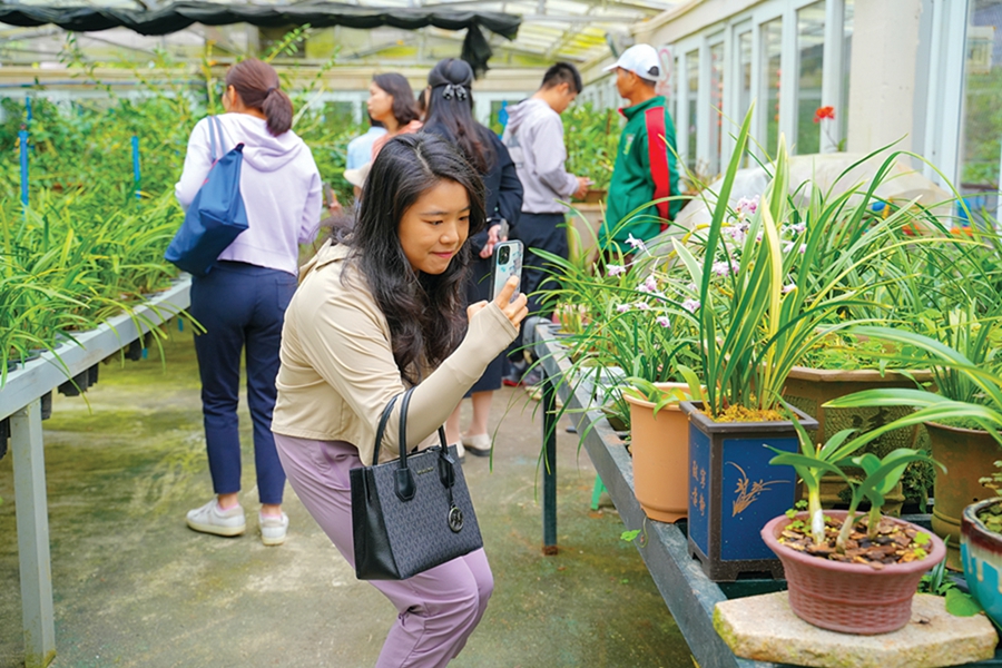 蘭花愛好者在南昆山翠蘭谷生態(tài)度假村“蘭園”內(nèi)賞蘭拍照留念。
