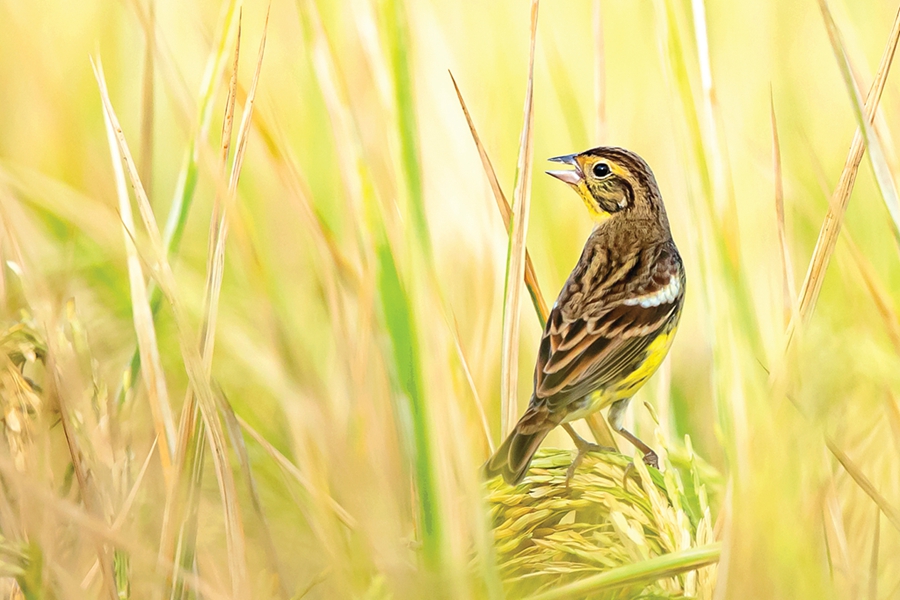 黃胸鹀是冬候鳥、旅鳥,棲息于平原的高草叢、稻田或蘆葦?shù)亍T诜敝称谛埒B的羽毛顏色艷麗,頭部發(fā)黑,背及翅膀呈栗色,頸部和胸部為鮮亮的黃色,中間橫貫一道栗色條帶。雌鳥整體偏淡,上體棕褐色,下體淡黃色,沒有栗色橫紋。