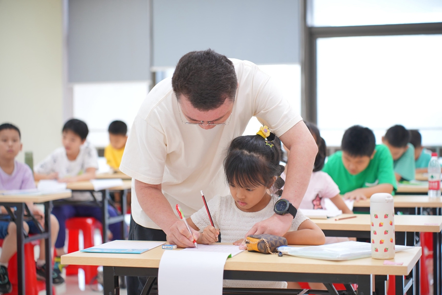 小朋友在書法培訓(xùn)班練習(xí)書法。