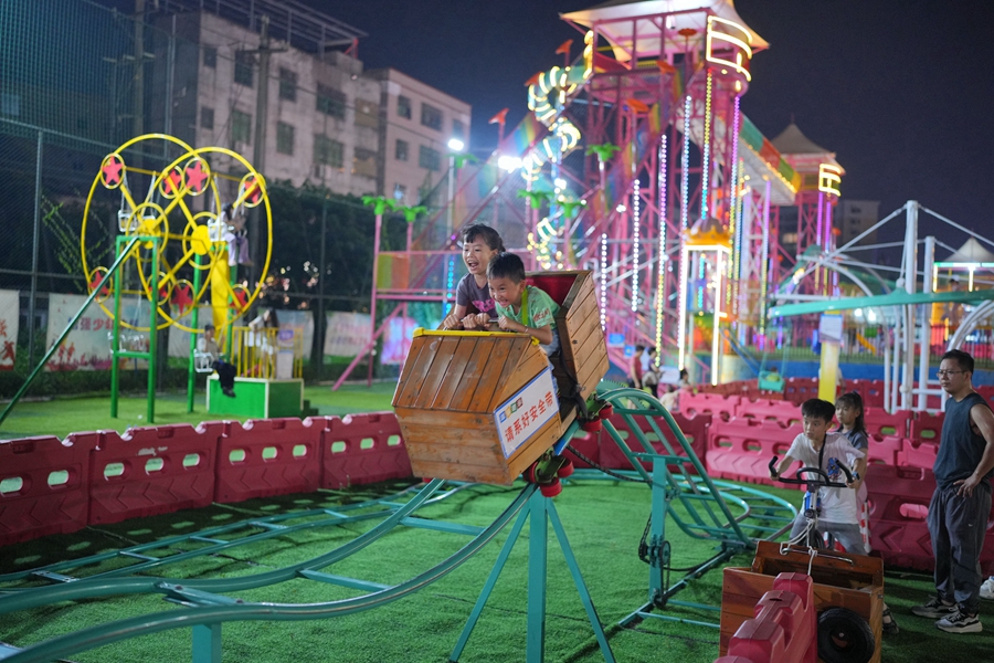 孩子在無動力樂園享受夜晚游園的樂趣。