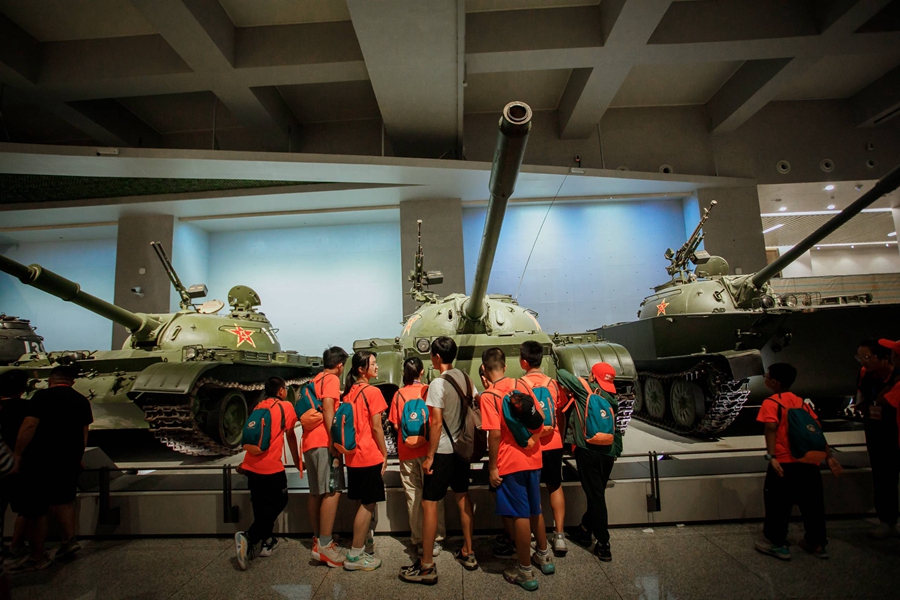 參加北京研學(xué)營的孩子們在軍事博物館參觀各類型軍事裝備。