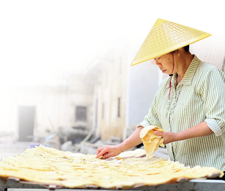 進(jìn)入新寮村,一棟棟樓房背后的竹海尤為引人注目。質(zhì)優(yōu)的甜竹多藏于其中,竹莖粗壯,最大的接近籃球的直徑。體型龐大的甜竹保證了新筍的產(chǎn)量,生長10年左右的甜竹每年可產(chǎn)150~200公斤鮮筍。盛滿筍片的竹匾鋪放在新寮村的各處堂前屋頂,是村民們辛勤勞作的成果。遠(yuǎn)遠(yuǎn)望去,一片片筍干就像是一片片黃金,閃耀著致富的光,照亮著鄉(xiāng)村振興之路。
