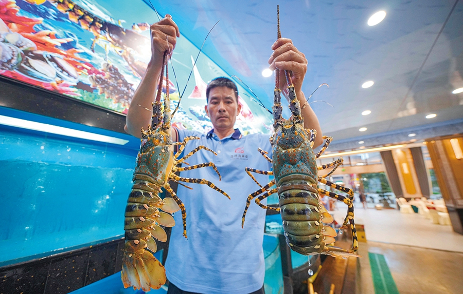 記者在酒樓內(nèi)看到,新店一樓設(shè)置了宴會廳及多個展示區(qū),酒柜上擺滿白酒、紅酒及洋酒琳瑯滿目的各種酒類,其中有不少年份久具有收藏價值的老酒。作為店里重要食材的海鮮展示區(qū),也設(shè)置在一樓,帝王蟹、澳洲龍蝦、鮑魚、生蠔、象拔蚌、石斑魚、各種貝殼類……幾十種生猛海鮮在水池里自由遨游,在顧客面前展示著生龍活虎的姿態(tài)!拔覀兯猩献朗巢亩际乾F(xiàn)場挑選捕撈,現(xiàn)點現(xiàn)煮,主打的就是新鮮!秉S楚斌順手撈起一只肉質(zhì)肥美的帝王蟹,向眾人展示起來。