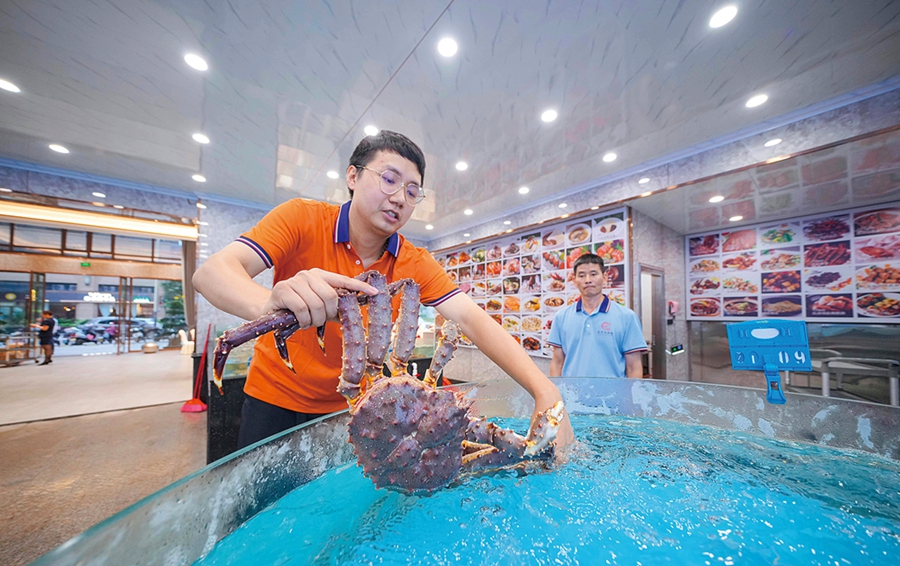 昌樺海鮮樓二代經(jīng)營者黃楚斌展示帝王蟹。