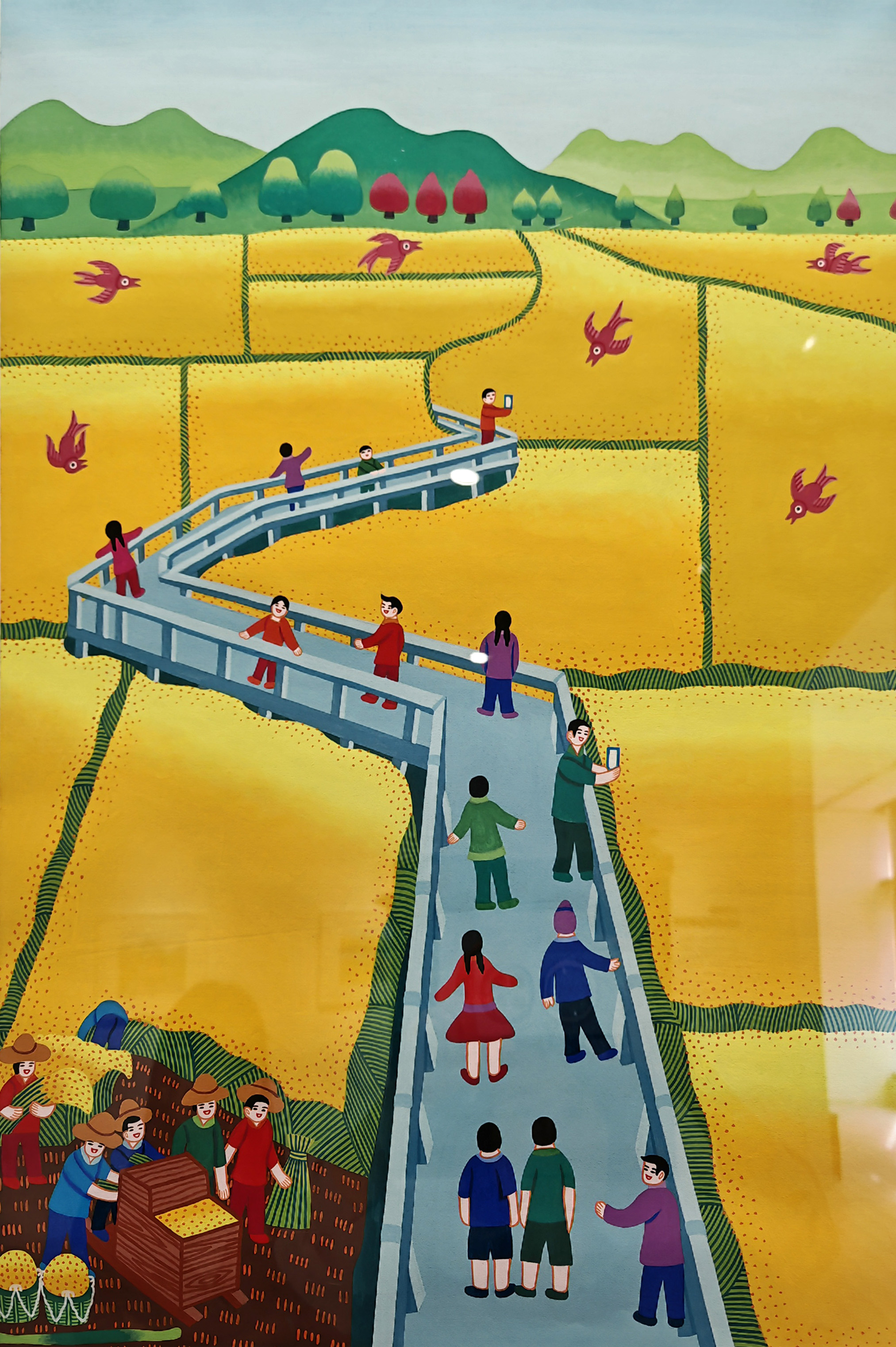 畫(huà)面里,金黃的田園廣袤如毯,蜿蜒的觀景步道串聯(lián)起詩(shī)意與煙火:游人們或漫步賞景、或定格美好,在田園風(fēng)光中盡享愜意;左下角的農(nóng)民們忙于豐收勞作,顆粒歸倉(cāng)的場(chǎng)景滿是農(nóng)耕的踏實(shí)與溫暖。