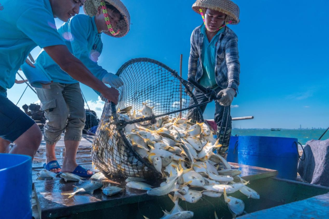 ▲南海之濱,漁獲滿倉(cāng),廣東漁民在碧海藍(lán)天下收獲滿滿一網(wǎng)金鯧魚(yú)。
