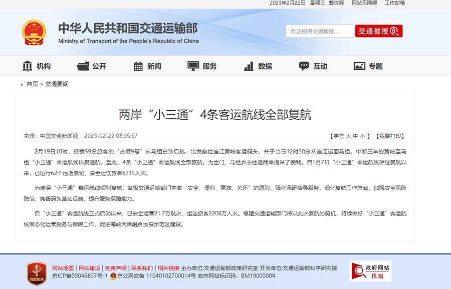 自“小三通”客運(yùn)航線(xiàn)正式啟動(dòng)以來(lái),已安全運(yùn)營(yíng)21.7萬(wàn)航次,運(yùn)送旅客2208萬(wàn)人次。福建交通運(yùn)輸部門(mén)將以此次復(fù)航為契機(jī),持續(xù)做好“小三通”客運(yùn)航線(xiàn)常態(tài)化運(yùn)營(yíng)服務(wù)與保障工作,促進(jìn)海峽兩岸融合發(fā)展示范區(qū)建設(shè)。