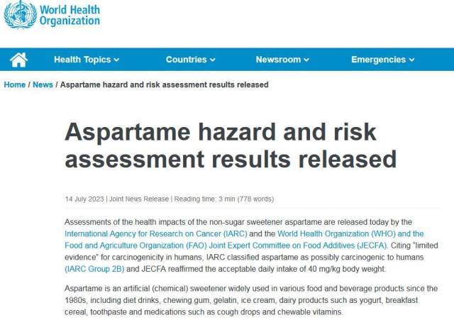 據(jù)世衛(wèi)組織官網(wǎng)14日消息,國(guó)際癌癥研究機(jī)構(gòu)(IARC)、世界衛(wèi)生組織(WHO)和糧食及農(nóng)業(yè)組織食品添加劑聯(lián)合專(zhuān)家委員會(huì)(JECFA)今天發(fā)布了阿斯巴甜對(duì)健康影響的評(píng)估結(jié)果。
