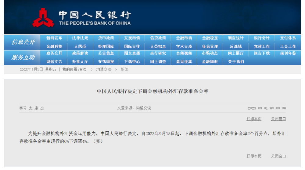 為提升金融機構(gòu)外匯資金運用能力,中國人民銀行決定,自2023年9月15日起,下調(diào)金融機構(gòu)外匯存款準(zhǔn)備金率2個百分點,即外匯存款準(zhǔn)備金率由現(xiàn)行的6%下調(diào)至4%。
