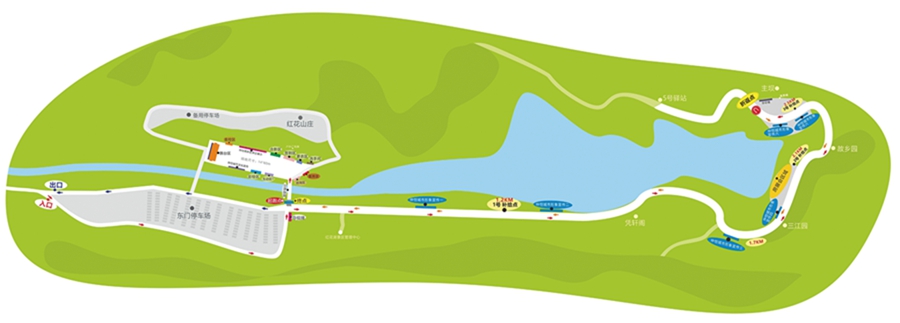 ●彩跑路線:紅花湖景區(qū)內(nèi)游客中心標(biāo)識(shí)處設(shè)起跑點(diǎn)和終點(diǎn),主壩處設(shè)折返點(diǎn),全長(zhǎng)約6公里