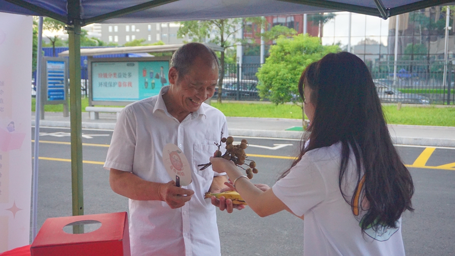 晶瑩的龍眼、香甜的芒果、飽滿的香蕉,在助農(nóng)產(chǎn)品攤上擺放著各式各樣水果,每一位前來(lái)觀看科普宣講的居民都可以免費(fèi)得到。攤位上的水果均是實(shí)踐隊(duì)成員向惠州當(dāng)?shù)毓r(nóng)收購(gòu),目的是讓居民品嘗到品質(zhì)優(yōu)良的水果,“食過(guò)返尋味”,向果農(nóng)購(gòu)買,以此助農(nóng)扶農(nóng)。隊(duì)員們?cè)诂F(xiàn)場(chǎng)拿著水果在攤位上向居民們展示,詳細(xì)地介紹了水果的產(chǎn)地和風(fēng)味。前來(lái)攤位的小朋友們還在現(xiàn)場(chǎng)品嘗了龍眼,他們還積極地為助農(nóng)產(chǎn)品攤做宣傳,“我回去喊我朋友也來(lái)吃水果!”