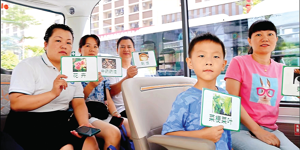 群眾帶著生活常見垃圾手牌乘坐對應的垃圾分類無人駕駛巴士。 惠州日報記者邱舒婷 魏怡蘭 通訊員曾嘉怡 攝