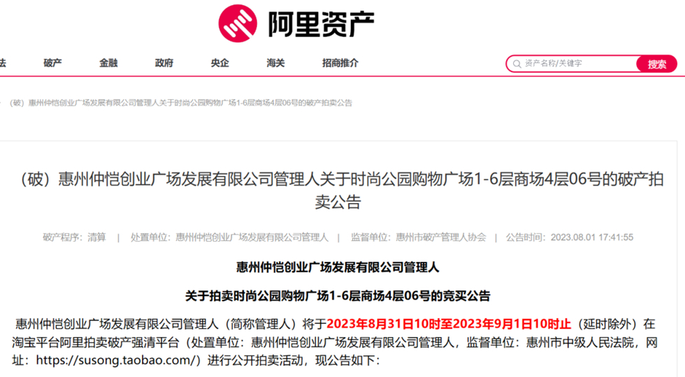 近日,阿里資產(chǎn)平臺(tái)發(fā)布了《(破)惠州仲愷創(chuàng)業(yè)廣場(chǎng)發(fā)展有限公司管理人關(guān)于時(shí)尚公園購(gòu)物廣場(chǎng)1—6層商場(chǎng)4層06號(hào)的破產(chǎn)拍賣公告》和《時(shí)尚公園購(gòu)物廣場(chǎng)1~6層商場(chǎng)108套商鋪》拍賣信息,起拍總價(jià)約13.5億元,將在2023年8月31號(hào)進(jìn)行網(wǎng)拍,引發(fā)市民關(guān)注!