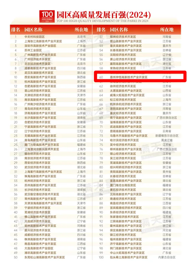 根據(jù)《報告》,廣東共有9個園區(qū)入選“園區(qū)高質(zhì)量發(fā)展百強(2024)”榜單,廣州、深圳、珠海、佛山、東莞、惠州、中山均有園區(qū)上榜。其中,惠州仲愷高新區(qū)位居第60名。
