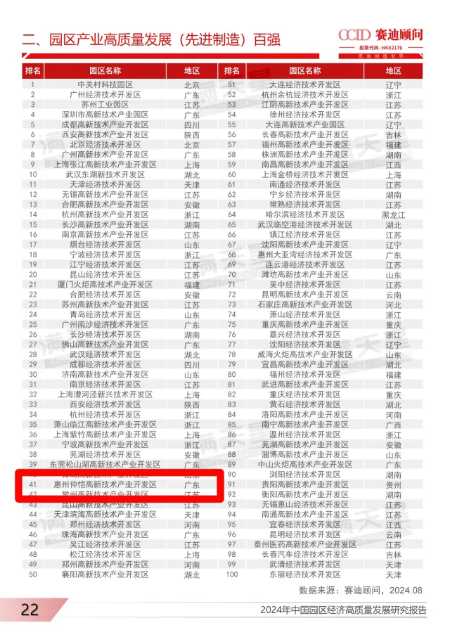 8月15日,研究機構(gòu)賽迪顧問全文發(fā)布《2024年中國園區(qū)經(jīng)濟高質(zhì)量發(fā)展研究報告》(下稱《報告》),公布“園區(qū)高質(zhì)量發(fā)展百強(2024)”榜單。其中,仲愷高新區(qū)上榜,成為惠州唯一入選的園區(qū)。