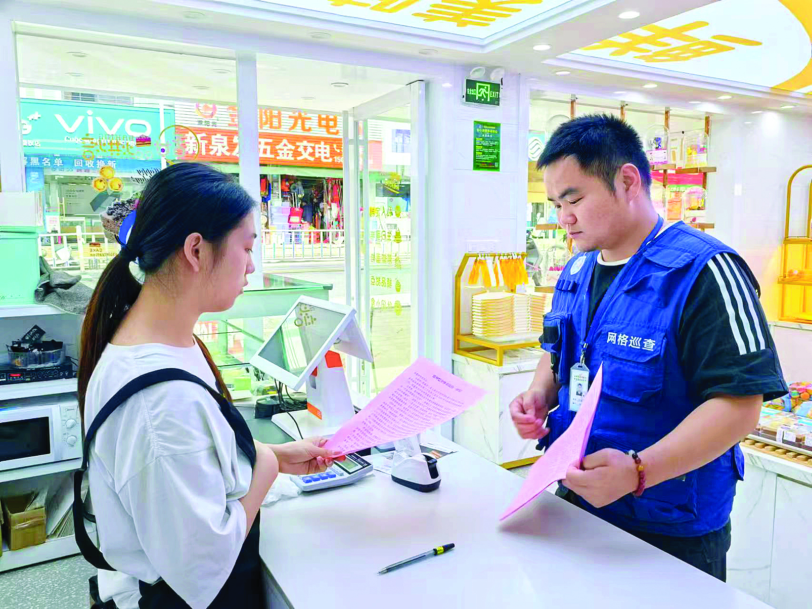 網(wǎng)格員向商戶做好宣傳工作。
