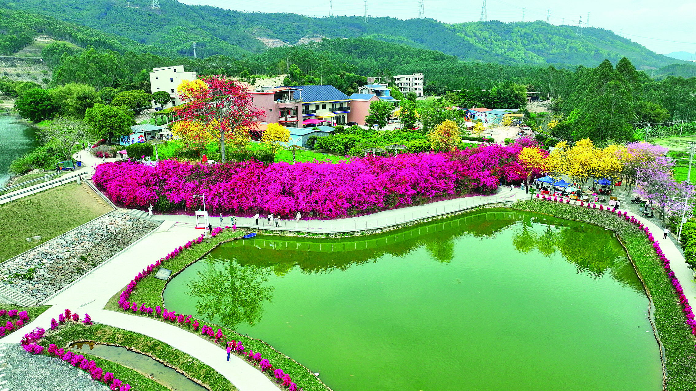 今年春節(jié)前夕,黃屋村啟動(dòng)建設(shè)“三角梅瀑布”周邊閑置土地改造升級(jí)項(xiàng)目,僅1個(gè)月時(shí)間就完成蛻變:石板路蜿蜒入景,玻璃護(hù)欄倒映花海,沿道三角梅點(diǎn)綴成景,臨時(shí)商業(yè)區(qū)域顯雛形……以三角梅為特色的村級(jí)公園儼然成形。