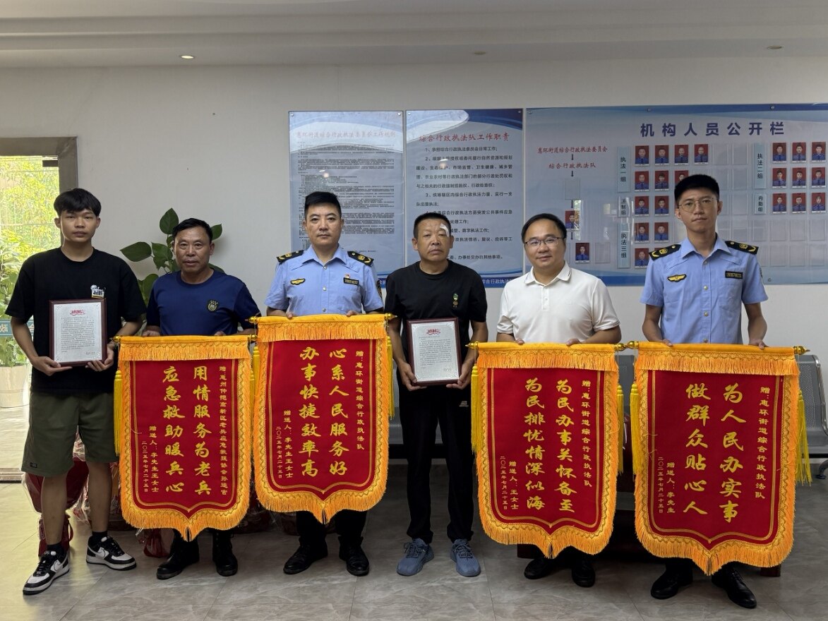 “他們救了我,我必須要找到他們!”近日,市民李先生幾經(jīng)輾轉(zhuǎn),來到仲愷高新區(qū)惠環(huán)街道綜合行政執(zhí)法隊,向救助他的執(zhí)法隊員,送上了錦旗和感謝信。原來,在臺風“韋帕”肆虐之際,李先生駕駛電動車外出發(fā)生碰撞,當場頭破血流。幸得巡邏的執(zhí)法隊員及時發(fā)現(xiàn)并伸出援手,最終化險為夷。