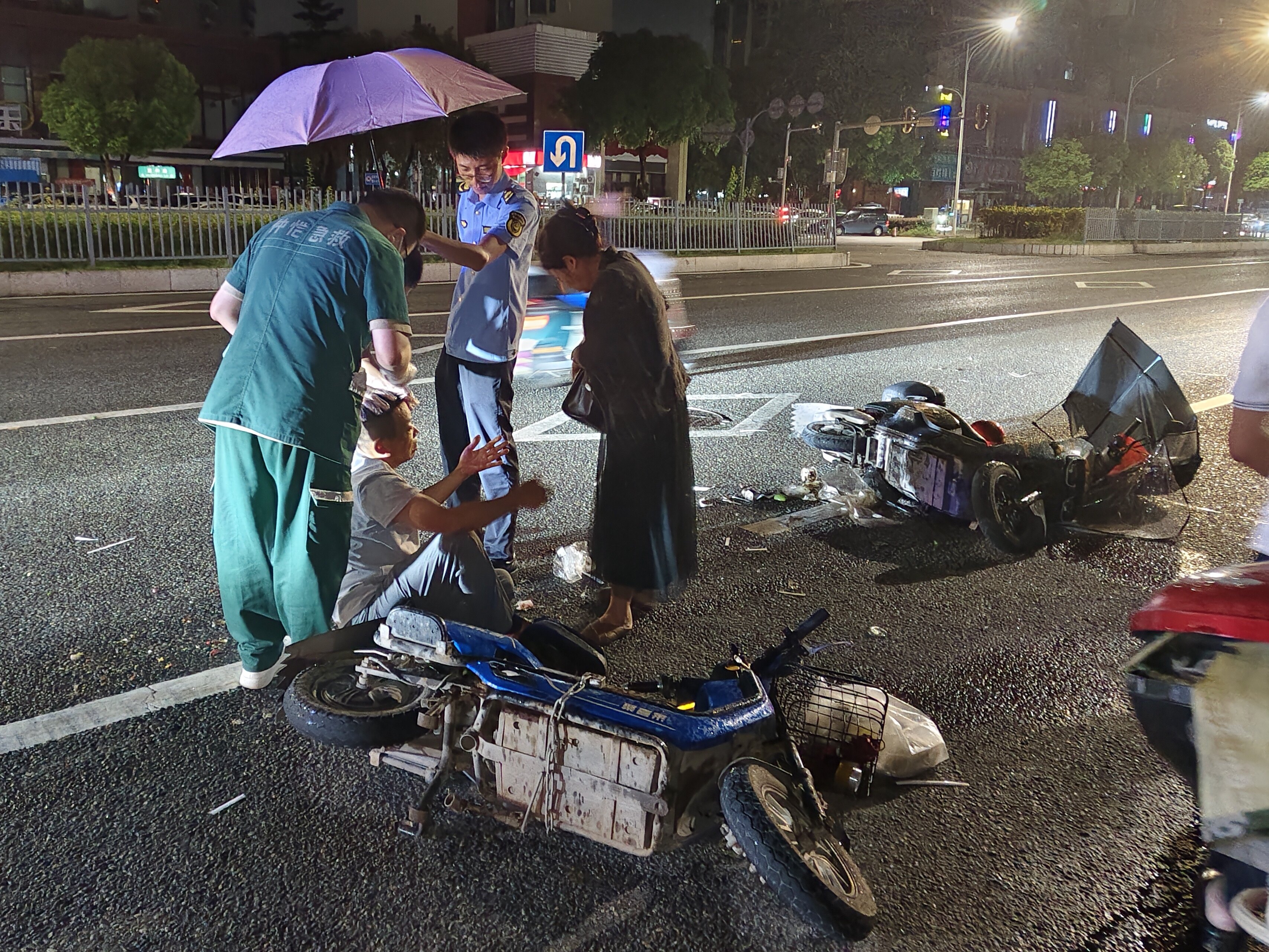 記者了解到,事發(fā)時是凌晨時分,臺風“韋帕”帶來大風大雨。當時,惠環(huán)街道綜合行政執(zhí)法隊的隊員們在轄區(qū)內(nèi)冒雨巡查,排查安全隱患。巡邏至和暢五路路段時,隊員們發(fā)現(xiàn)兩輛電動車倒在路面上,還遠遠傳來哭聲。他們立即上前查看,發(fā)現(xiàn)一名年輕女子受了傷正在哭泣。而李先生也被摔得頭破血流,他的妻子被這一場面嚇到,只是無助痛哭。了解現(xiàn)場情況后,隊員們迅速撥打了120急救電話。在等待救護車的過程中,他們一邊維持現(xiàn)場秩序,疏導過往車輛,一邊安撫傷者及其家屬。由于擔心傷者淋雨加重傷勢,他們還紛紛撐傘為李先生遮擋傷口,任憑雨水打濕制服,成為了風雨中最可靠的屏障。當救護車抵達,隊員們又合力將傷者抬上擔架,詳細向醫(yī)護人員說明情況,直到救護車消失在雨幕中,才默默整理好濕透的制服繼續(xù)巡邏。