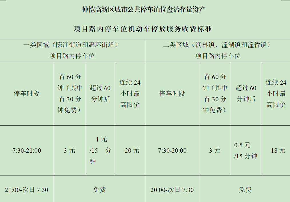 根據(jù)《關(guān)于仲愷高新區(qū)城市公共停車泊位盤活存量資產(chǎn)項目路內(nèi)停車位機(jī)動車停放服務(wù)收費有關(guān)事項的批復(fù)》(惠仲經(jīng)統(tǒng)價〔2025〕14號)文件,收費標(biāo)準(zhǔn)為: