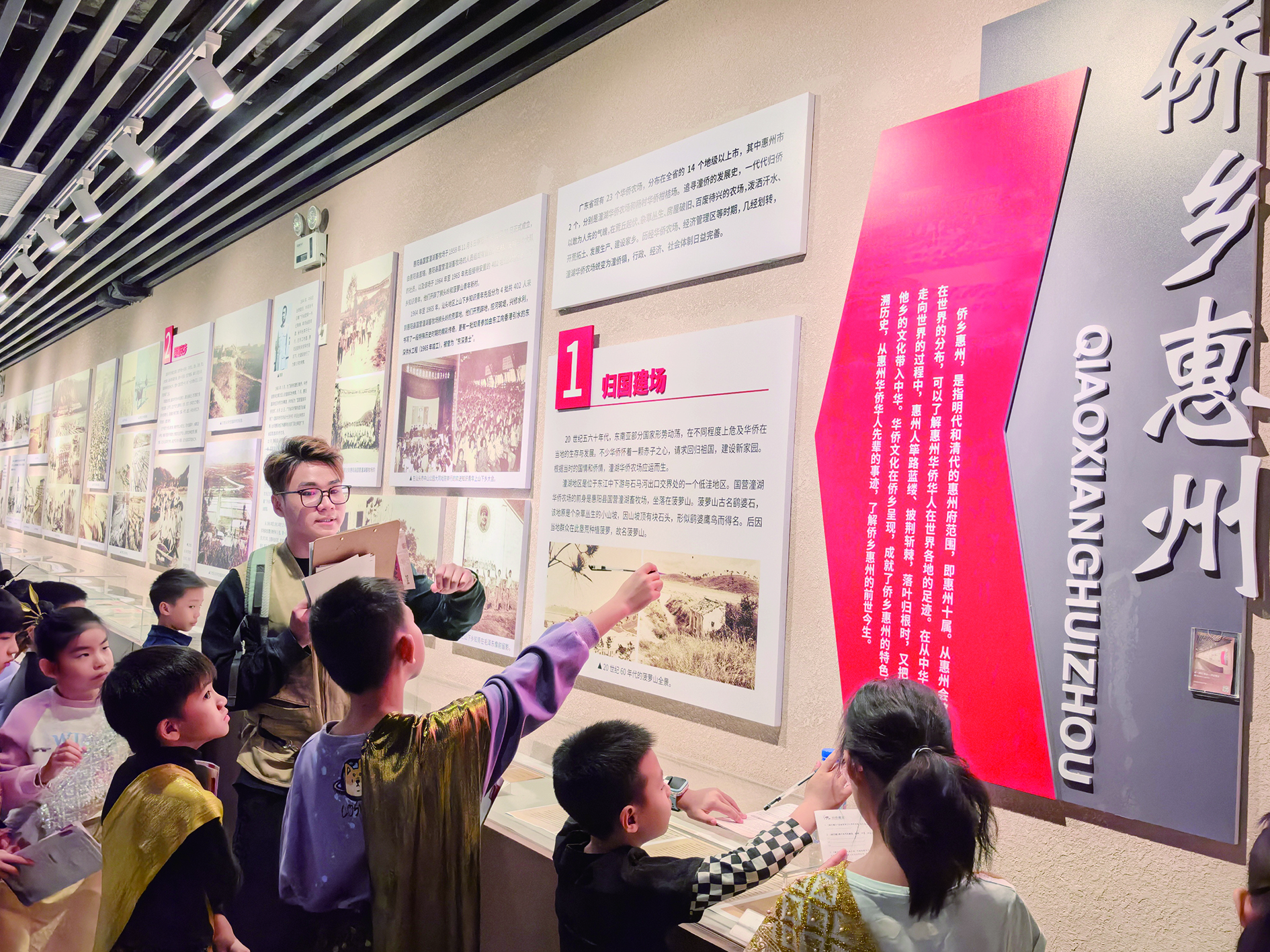 “1966年,潼湖華僑農(nóng)場(chǎng)成立,來自印尼、緬甸等14個(gè)國家的歸僑聚集在這里,他們把這里當(dāng)成了新家!痹凇皻w僑建設(shè)”展區(qū),當(dāng)年歸僑和知青開墾荒地、修建堤壩的老照片吸引了孩子們的目光。黑白影像中,歸僑們背著農(nóng)具在泥濘的土地上勞作,知青們挽著褲腳修建水庫,艱苦的環(huán)境與他們堅(jiān)毅的眼神形成鮮明對(duì)比!爱(dāng)時(shí)的潼僑‘一日大雨水汪汪,三日無雨田龜裂’,歸僑和知青們就是在這樣的地方,建起了茶園和家園!睂(dǎo)師的話語讓孩子們深受觸動(dòng),不少人拿出研學(xué)手冊(cè)認(rèn)真記錄著。