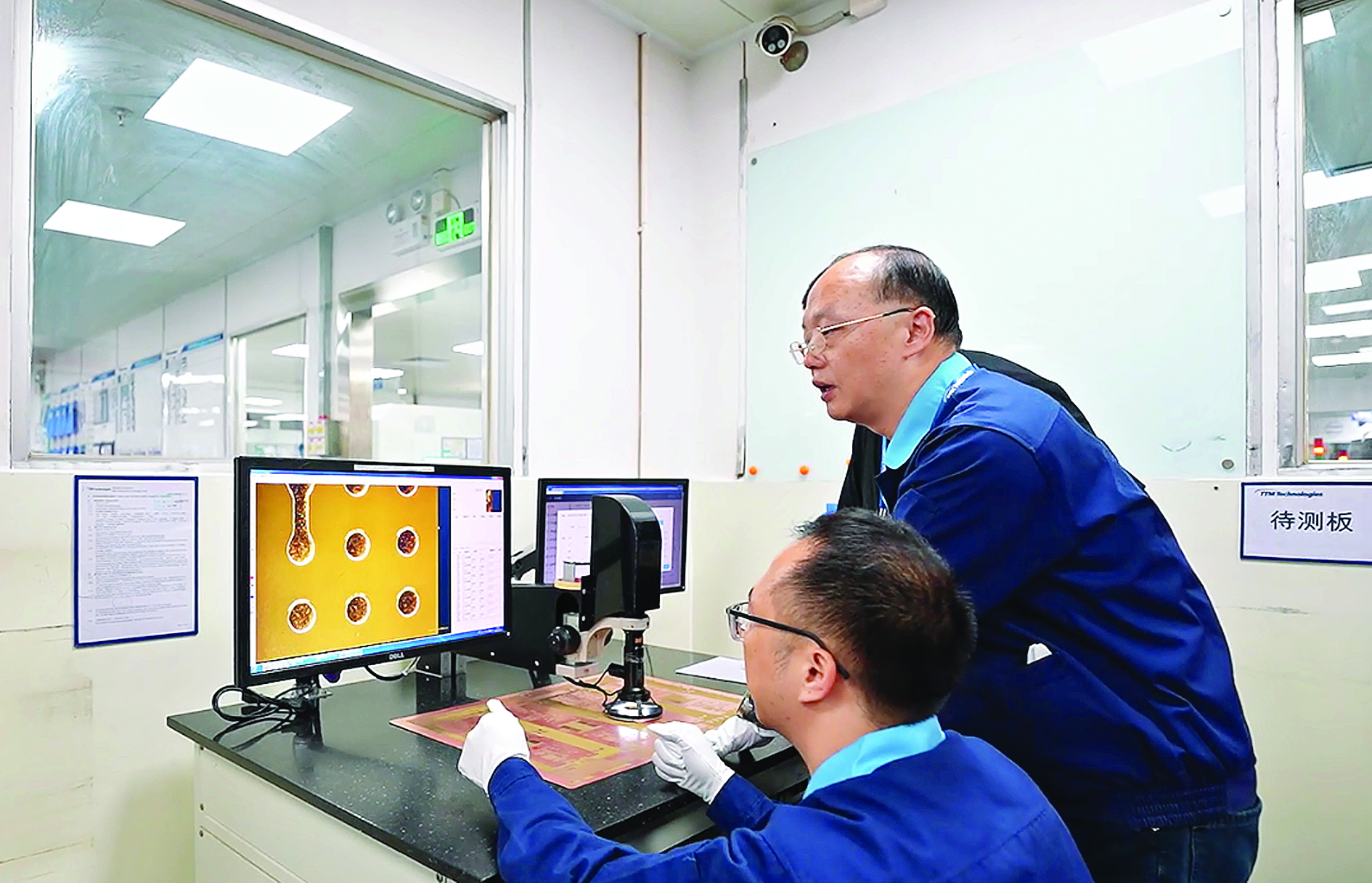 關(guān)鍵時刻,黨員站了出來。中共黨員、省五一勞動獎?wù)芦@得者熊文忠主導(dǎo)的金鹽節(jié)省工藝,歷經(jīng)數(shù)月的試產(chǎn)調(diào)整終獲成功,這項成果不僅打破國外壟斷,還將藥水和金鹽用量降低約10%,每年為公司節(jié)約近1000萬元,技術(shù)指標(biāo)更遠(yuǎn)超行業(yè)平均水平,贏得美國總部高度認(rèn)可。無獨有偶,2024年,羅文濤、劉晉志和張培泉三位黨員技術(shù)骨干主動請纓,組建“突擊隊”,無數(shù)個深夜,他們在實驗室反復(fù)調(diào)試參數(shù),歷經(jīng)7次重大方案修改,攻克20余項技術(shù)難關(guān),終于在2025年成功研發(fā)出“一種板內(nèi)引線電金的PCB板生產(chǎn)工藝”,創(chuàng)新發(fā)明專利,實現(xiàn)該技術(shù)在PCB領(lǐng)域關(guān)鍵工藝上的新突破。
